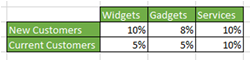 =IF(New?=”Yes”,Widget*0.1+Services*0.1+Gadget*0.08, Widget*0.05+Services*0.1+Gadget*0.05)