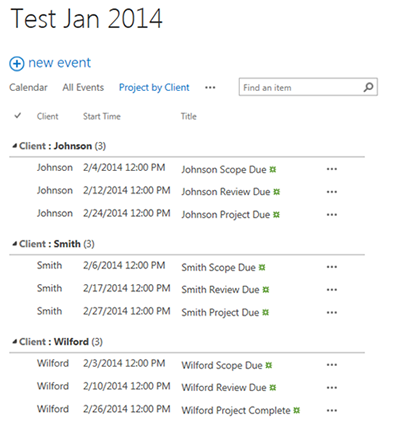 Use metadata filters to create views of calendars that show only a portion of the events. For example, in the project calendar from above, you may want to create a view of only the Wilford client events to place on the Wilford project page. This is fairly simple to do.