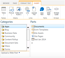- Under the Insert Tab, choose “Web Part”, and select your web part.