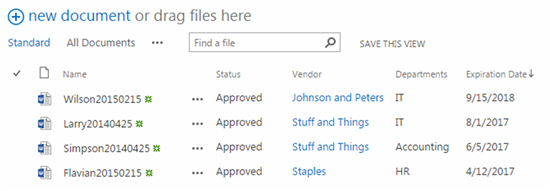 I can sort and filter the document library by these metadata columns to create unique views of the documents. For example, I can filter it to only show IT contracts that are approved or Under Review.